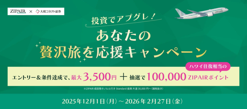 大和コネクト証券とZIPAIRが共同キャンペーン「投資でアプグレ!あなたの贅沢旅を応援キャンペーン」を実施