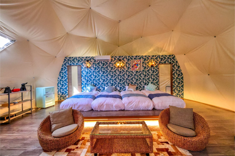 わずか3棟のみの贅沢な配置で、各棟は独立した設計となっています。専用の大型テラス、トイレ、シャワールームを完備しており、チェックインからチェックアウトまで、プライベートな「別荘」感覚で過ごせます。他者の視線を気にせず、グループや家族でくつろげる安心感が支持されています。