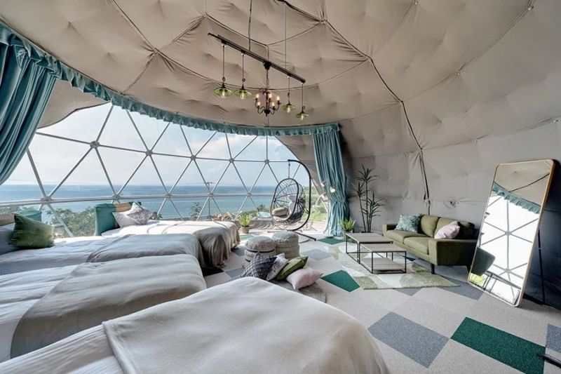 淡路島西海岸の人気エリアに位置する「ブリーズガーデン淡路」では、夕方には水面に沈む美しいサンセットを眺めることができます。全4棟限定の大型ドームテントは7mを超える広々とした空間で、優雅なリゾートステイが楽しめます。