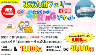 2026年4月乗船限定で、55歳以上の方を対象としたお得な「東京九州フェリースプリングチケット」が発売されました。横須賀港から九州へ、片道から利用でき、船内で使えるマルチクーポン4,000円分が付帯します。露天風呂やプラネタリウムなど充実した船内設備で、快適な船旅を満喫しながら九州旅行を楽しめます。