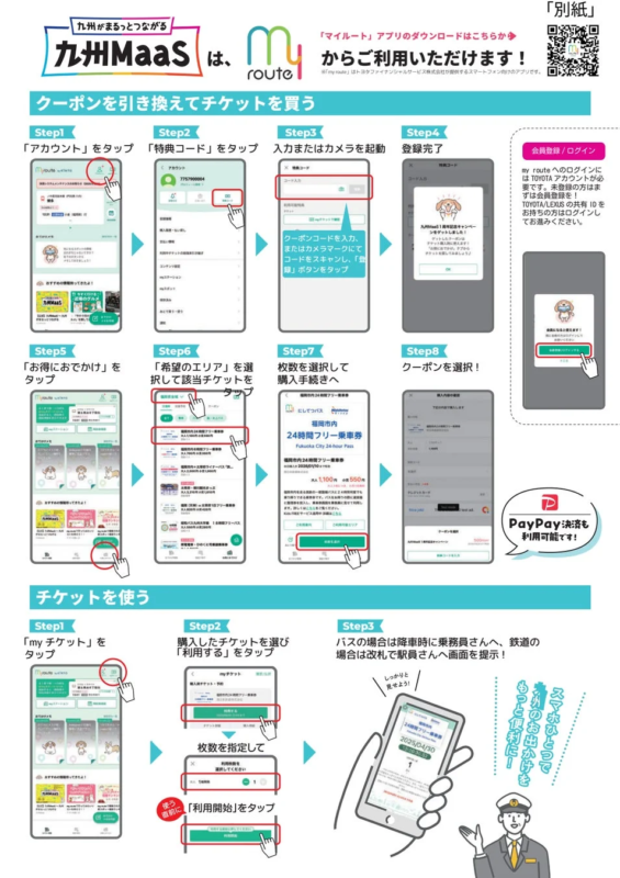 このお得なきっぷを利用するには、スマートフォンアプリ「my route」が必要です。以下の手順でクーポンを取得し、きっぷを購入できます。