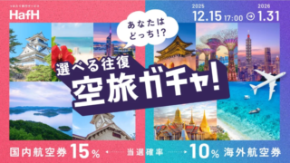 つみたて旅行サービス「HafH」が累計宿泊数80万泊を突破し、これを記念して2つの大型キャンペーンを2025年12月15日より同時開催します。新規会員向けの初月最大80%OFFキャンペーンに加え、人気の「空旅ガチャ」には韓国や台湾など5つの海外エリアへの往復航空券が当たるチャンスが追加されました。